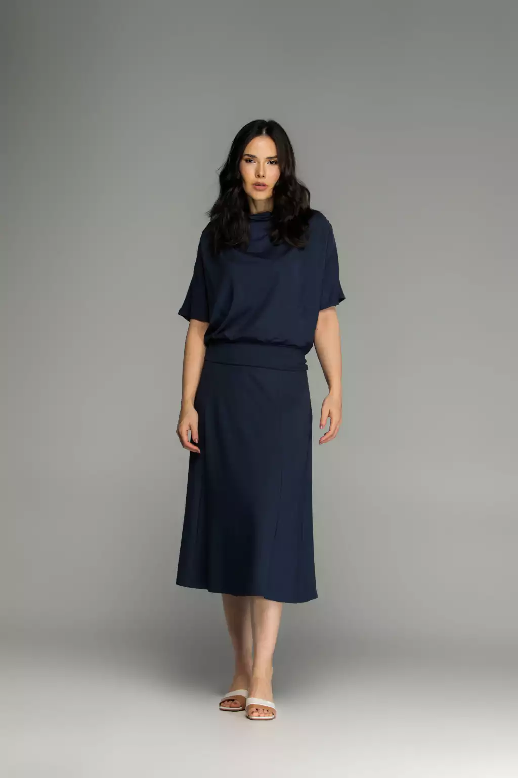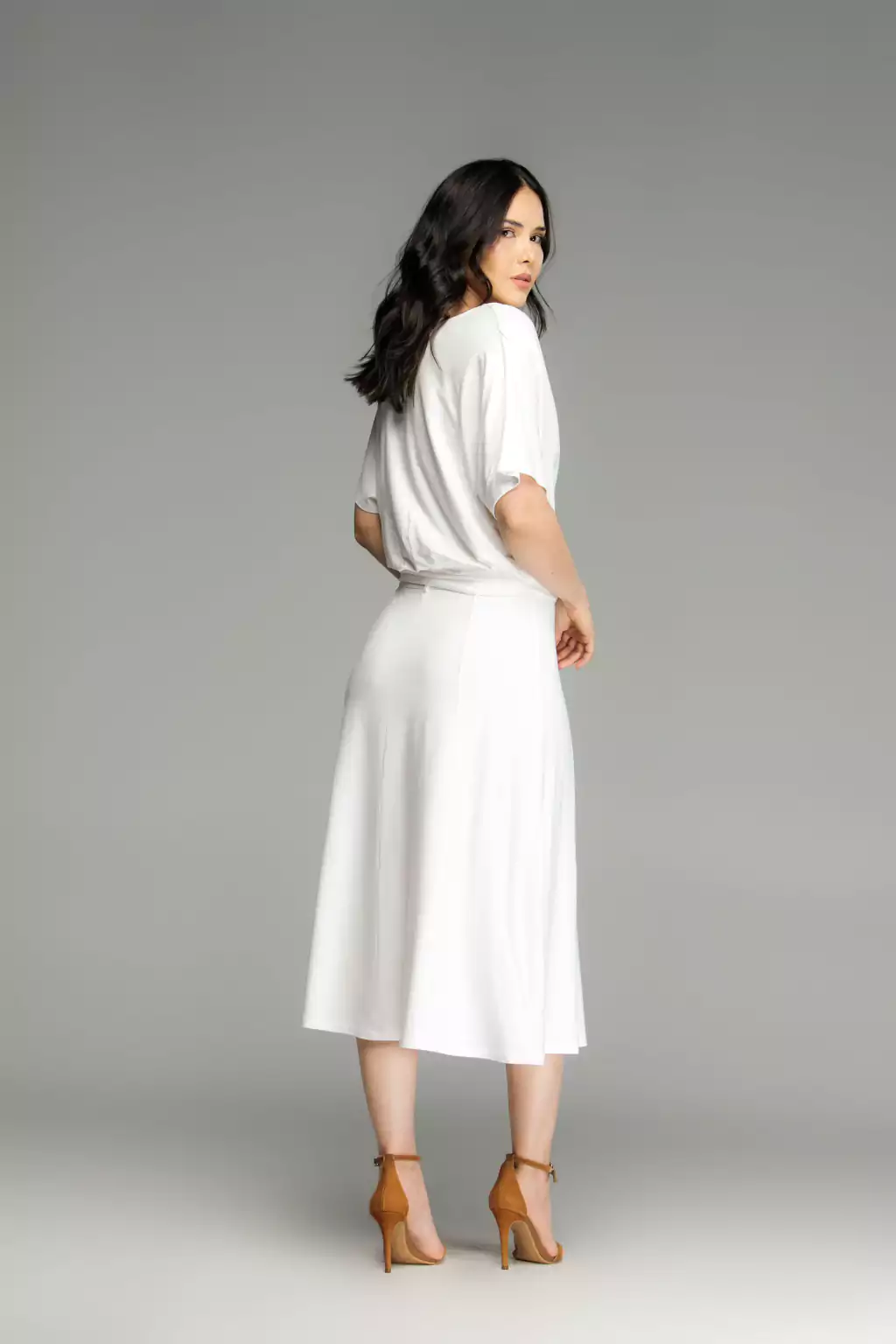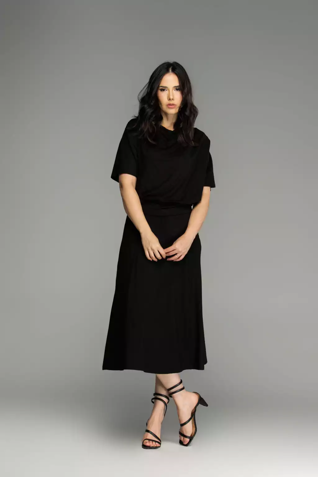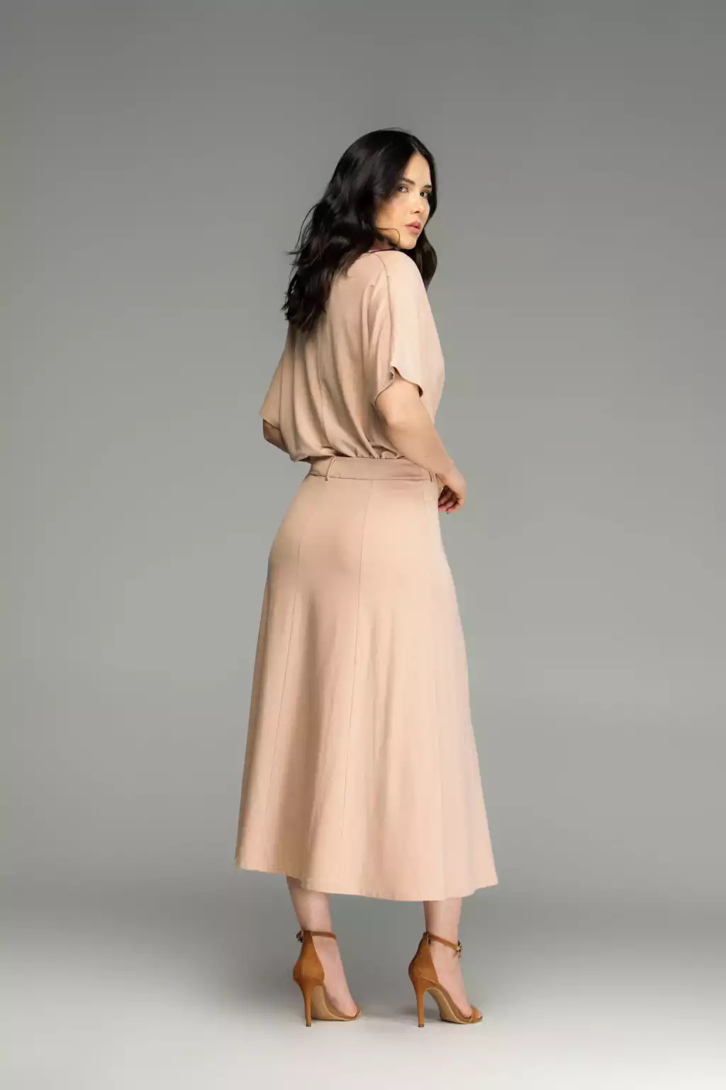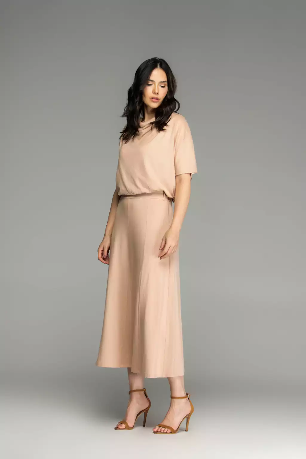 CONJUNTO NICE é a escolha ideal para quem busca um estilo que transita entre o casual e o sofisticado. Feito em moletinho premium, conta com gola drapê, mangas tipo japonesa, modelagem soltinha e detalhe em punho no cós. Já a saia tem compimento midi, modelagem evasê, detalhes em nesgas e síper na lateral para melhor ajuste.