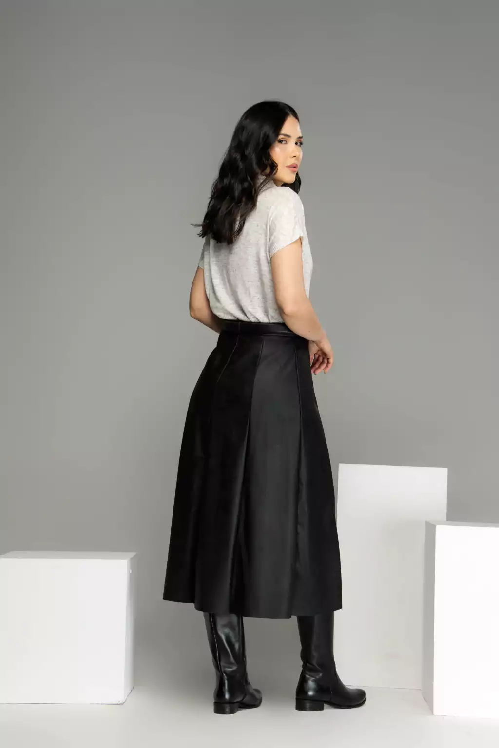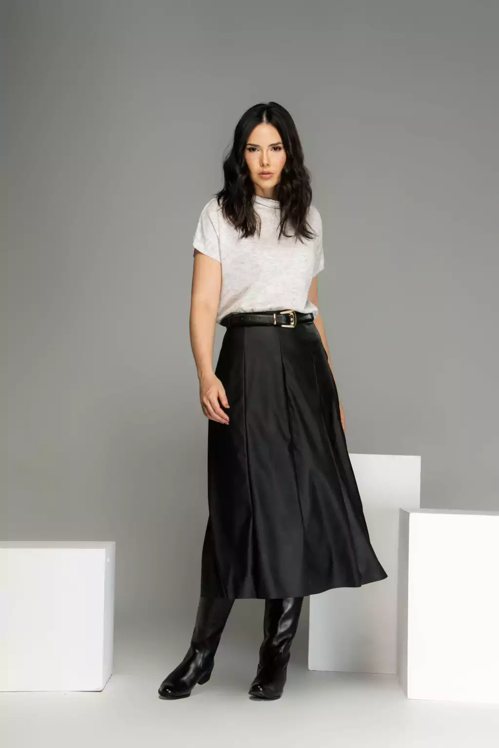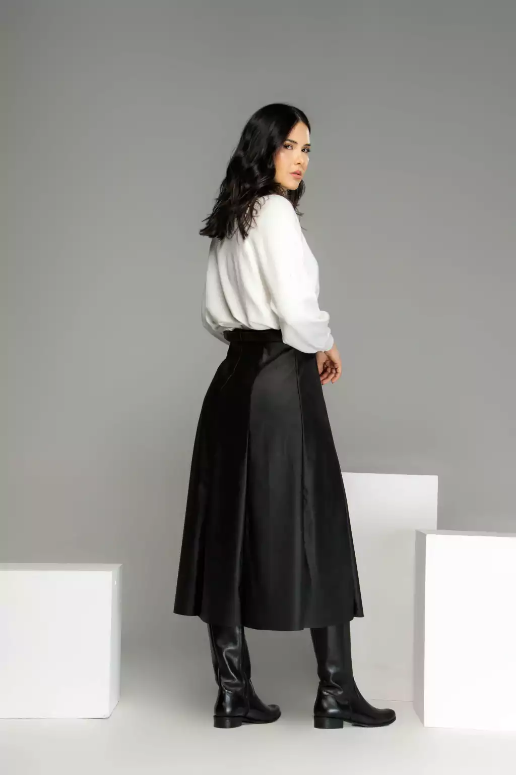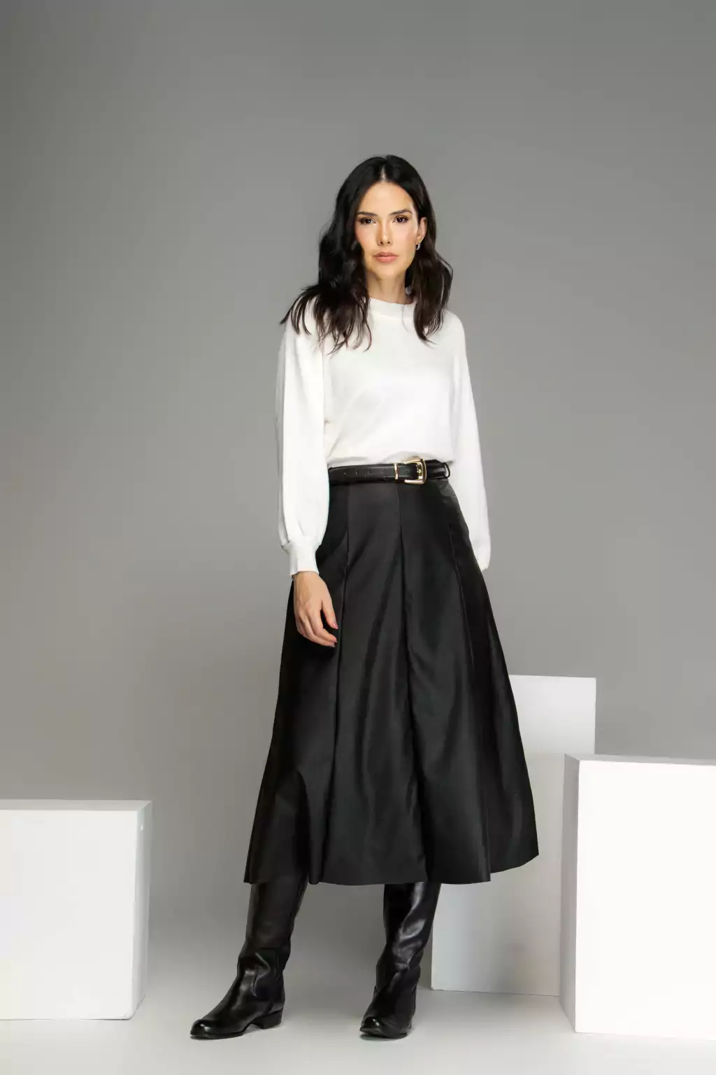 SAIA COURO RECORTES é uma das peças clássicas de inverno em uma versão repaginada. O diferencial se dá pela modelagem evasê, que valoriza diversos tipos de corpos. Além disso, é uma peça essencial no seu guarda roupa pois multiplica as suas composições.